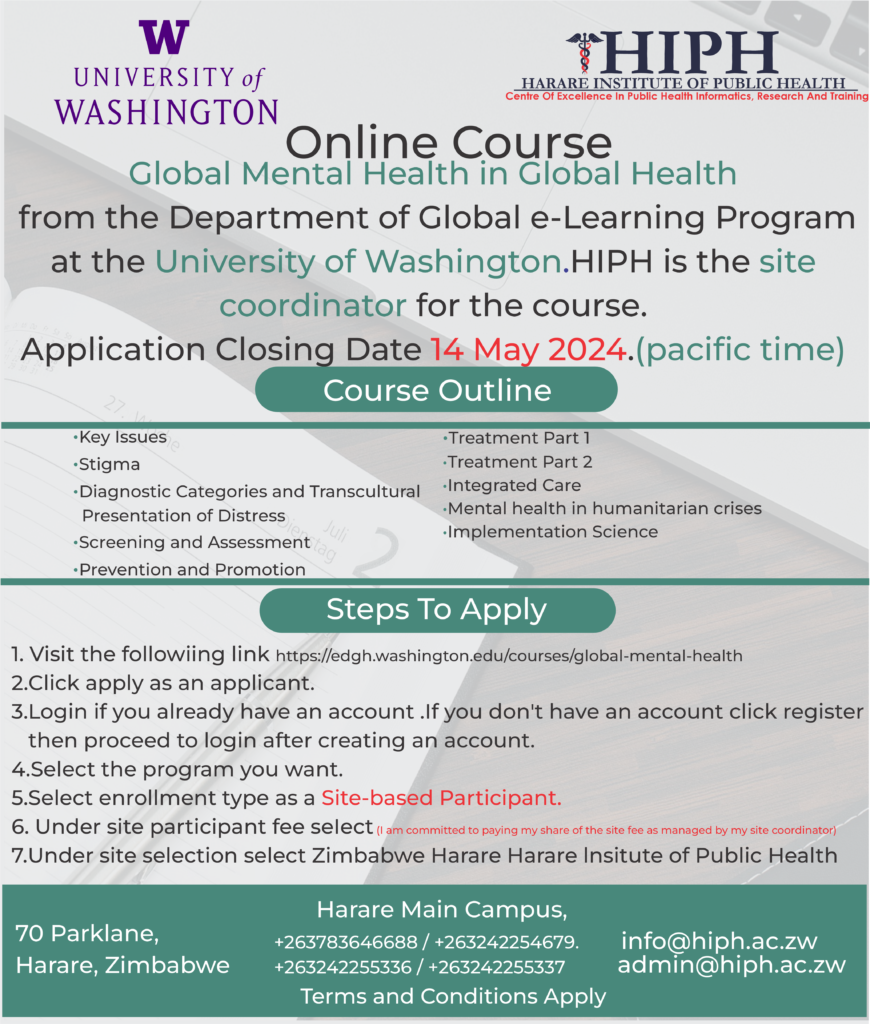 University of Washington in collaboration with Harare Institute of Public Health as the site coordinator is offering an online course in Global Mental Health in Global Health , Project Management in Global Health and Economic Evaluation in Global Health awarded by the University of Washington.